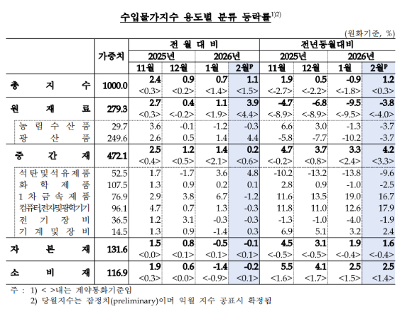 원재료는 원유 등 광산품을 중심으로 전월보다 3.9% 상승했다. 중간재는 1차 금속 제품이 내렸으나 석탄·석유제품이 오르면서 전월보다 0.2% 상승했다. 자본재와 소비재는 각각 전월 대비 0.1%, 0.2% 하락했다.