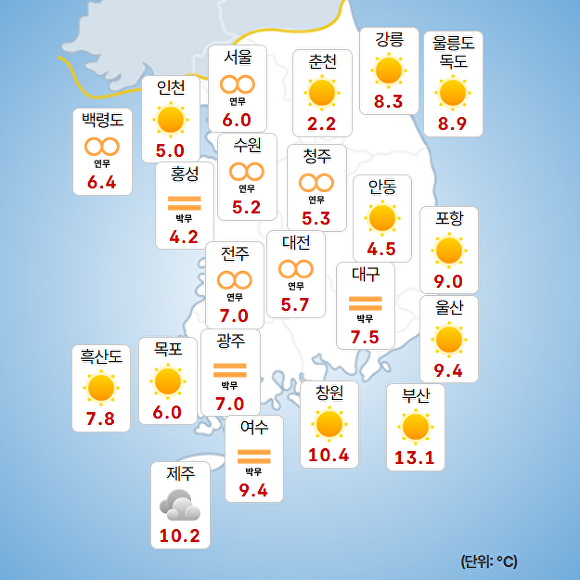 부산지방기상청에 따르면 이날 오전 9시 현재 주요 지역의 기온은 부산 13.1도, 울산 9.4도, 창원 10.4도로 기록됐다.