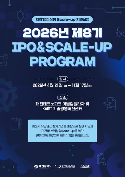 [아이뉴스24 강일 기자] 대전테크노파크(대전TP)는 지역 유망 기업의 체계적인 상장과 스케일업(Scale-up) 지원을 위한 ‘제8기 IPO&Scale-Up Program’ 참여기업을 모집한다고 17일 밝혔다.