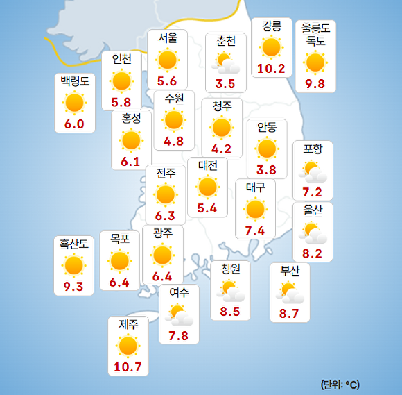 부산지방기상청에 따르면 이날 오전 9시 현재 주요 지역의 기온은 부산 8.7도, 울산 8.2도, 창원 8.5도로 기록됐다.