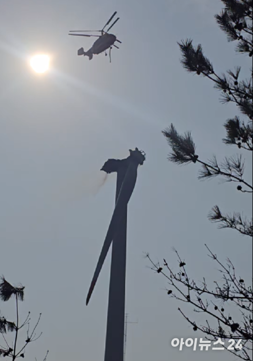 경북소방본부 등에 따르면 이날 오후 1시 11분쯤 단지 내 19호기 풍력발전기 프로펠러 부위에서 불이 났다는 신고가 접수됐다.