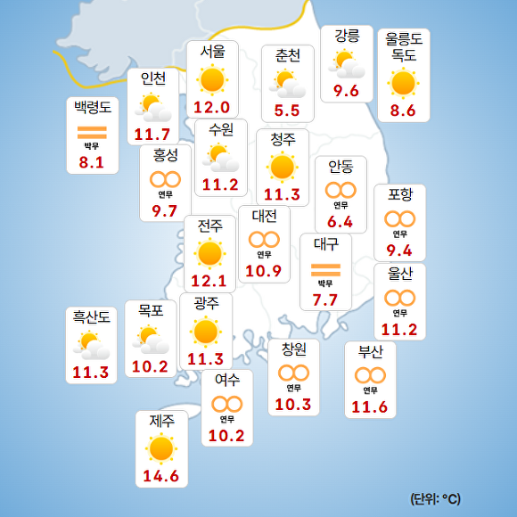 부산지방기상청에 따르면 이날 오전 9시 현재 주요 지역의 기온은 부산 11.6도, 울산 11.2도, 창원 10.3도로 기록됐다.
