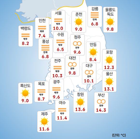 부산지방기상청에 따르면 이날 오전 9시 현재 주요 지역의 기온은 부산 14.3도, 울산 13.1도, 창원 11.9도로 기록됐다.