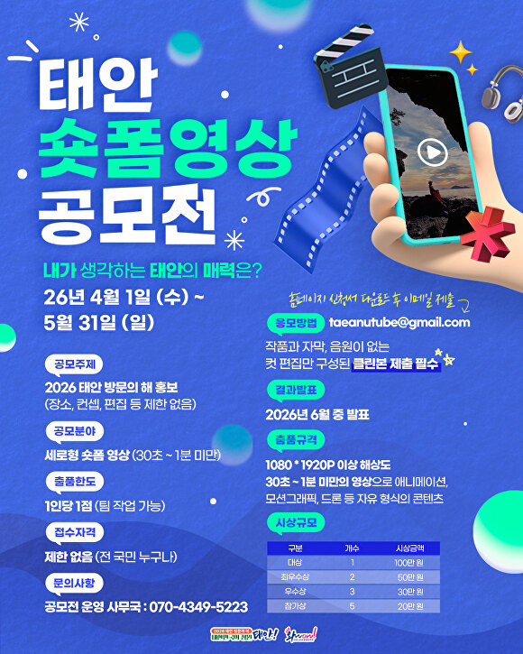 상반기 공모 주제는 ‘2026 태안 방문의 해’ 홍보다. 참가자는 자연경관, 축제, 먹거리 등 태안의 관광자원을 소재로 30초 이상 60초 이내 영상을 제작해 제출하면 된다. 장소와 콘셉트, 편집 방식에는 제한을 두지 않았다.
