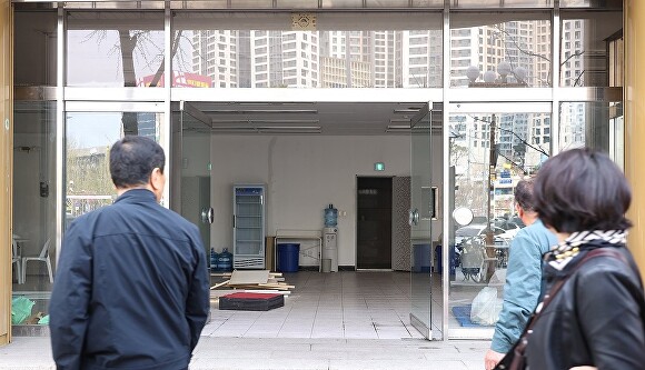 29일 대구 달서구 두류네거리를 지나는 시민들이 공사 중인 김부겸 전 총리의 대구시장 선거사무소를 구경하며 발걸음을 옮기고 있다. 김 전 총리는 해당 건물 3개 층을 사용할 것으로 전해졌다 [사진=연합뉴스]