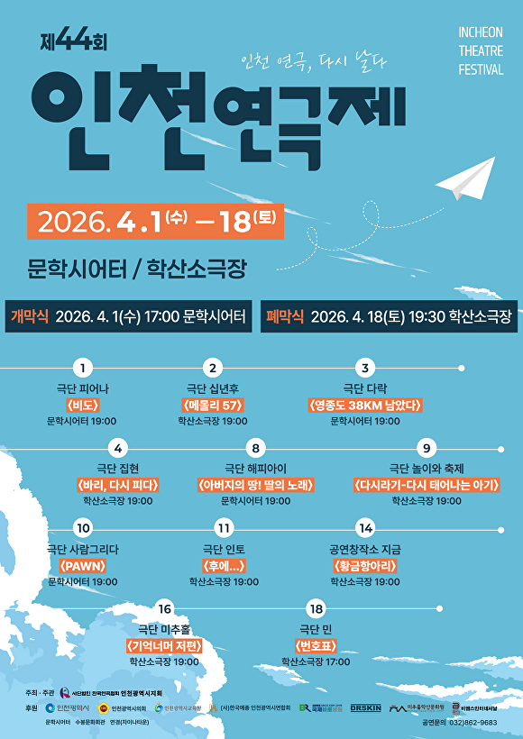 [아이뉴스24 이진수 기자] 인천광역시는 지역 연극계 창작 역량을 결집하고 시민 문화 향유 기회를 확대하기 위해 ‘제44회 인천연극제’가 오는 4월 1일부터 18일까지 문학시어터와 학산소극장에서 열린다고 밝혔다.