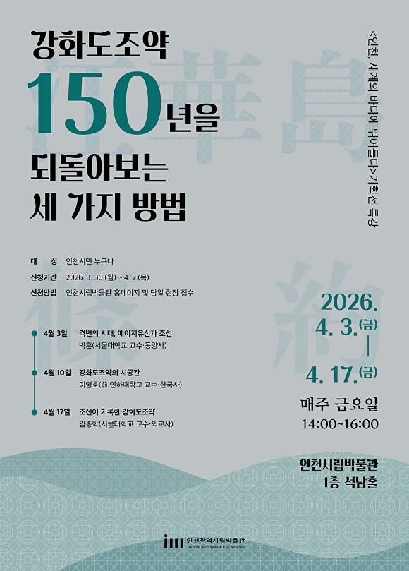 [아이뉴스24 이진수 기자] 인천광역시 시립박물관은 강화도조약 체결 150주년을 맞아 4월 3일부터 17일까지 기획전 연계 특강 「강화도조약을 되돌아보는 세 가지 방법」을 운영한다고 밝혔다.