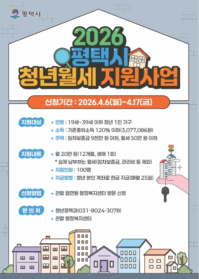 지원 대상은 공고일 기준 평택시에 거주하는 무주택 청년 1인 가구로, 임차보증금 9000만원 이하 및 월세 50만원(관리비 제외) 이하인 주택에 거주해야 한다.