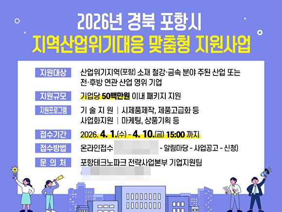 (재)포항테크노파크는 '2026년 지역산업위기대응 맞춤형 지원사업' 참여기업을 오는 10일까지 모집한다고 1일 밝혔다.