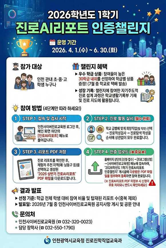 [아이뉴스24 장호찬 기자] 인천광역시교육청(교육감 도성훈)은 학생 자기주도적 진로 설계 역량을 강화하기 위하여, 4월 1일부터 6월 30일까지 ‘1학기 진로 AI리포트 인증 챌린지’를 운영한다.