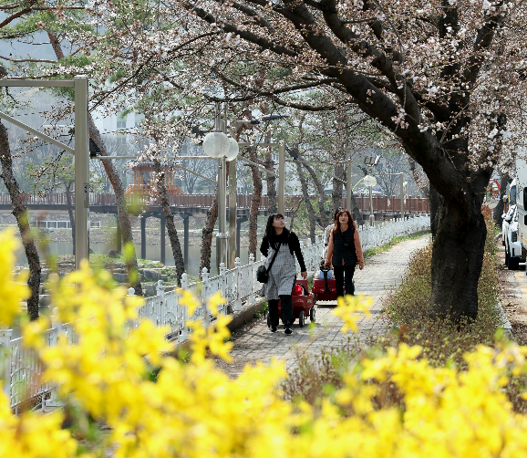 [아이뉴스24 안영록 기자] 충북 괴산군 괴산읍 동진천변 산책로에 봄꽃이 활짝 펴 가족 단위 나들이객이 산책을 즐기고 있다. 개나리 뒤편 산책로를 따라 연분홍빛 벚꽃도 꽃망울을 터트리기 시작해 봄 정취를 더한다. 동진천은 화사한 봄꽃에 이어, 음악분수와 미디어파사드, 괴산오작교를 비롯한 수변 공간을 갖춰 주·야간 주민과 방문객들로부터 사랑을 받고 있다.