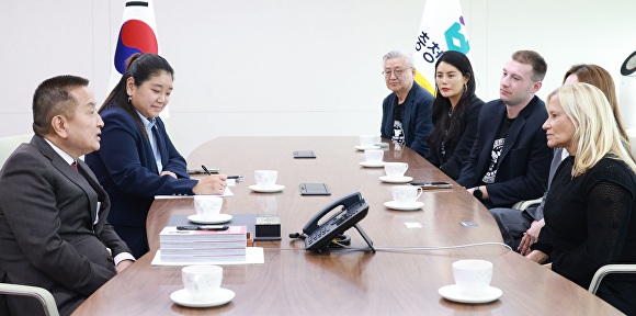 김영환(왼쪽) 충북도지사가 3일 충북도청 문화홀에서 앨런 스미스(오른쪽) 뉴욕페스티벌 CEO와 환담하고 있다. [사진=충북도]