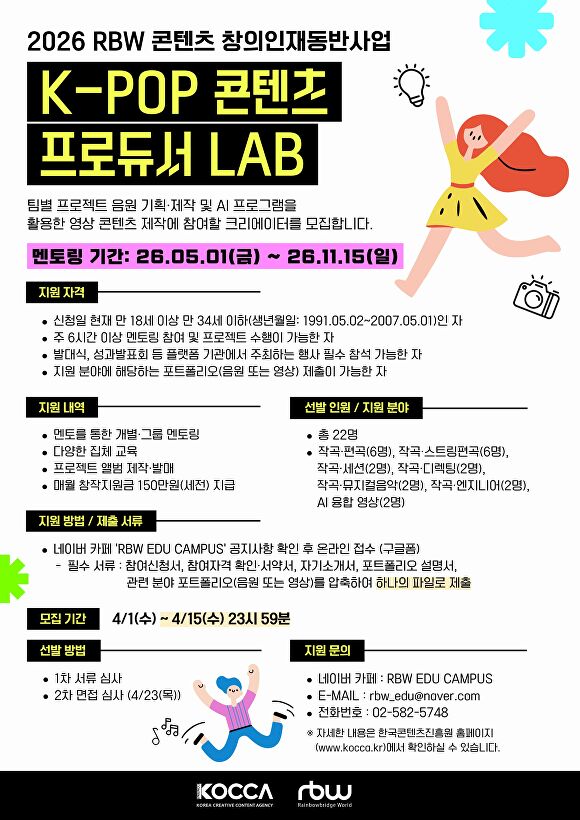 [아이뉴스24 서병기 기자] 한국콘텐츠진흥원이 주관하고 종합 콘텐츠 기업 ㈜알비더블유(이하 RBW)가 운영하는 '2026 콘텐츠 창의인재동반사업'이 지난 1일 멘티 모집을 시작했다.
