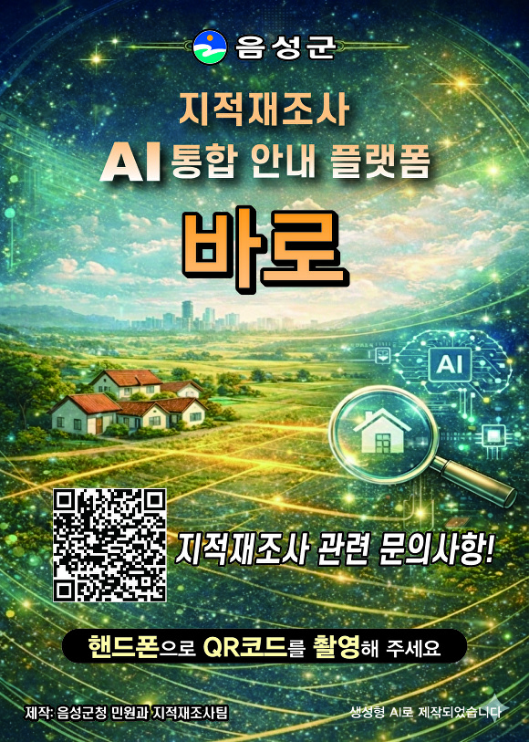 [아이뉴스24 소진섭 기자] 충북 음성군은 지적재조사 민원 편의성을 높이기 위해 AI(인공지능) 기반 통합 안내플랫폼 ‘바로’를 운영한다고 7일 밝혔다.