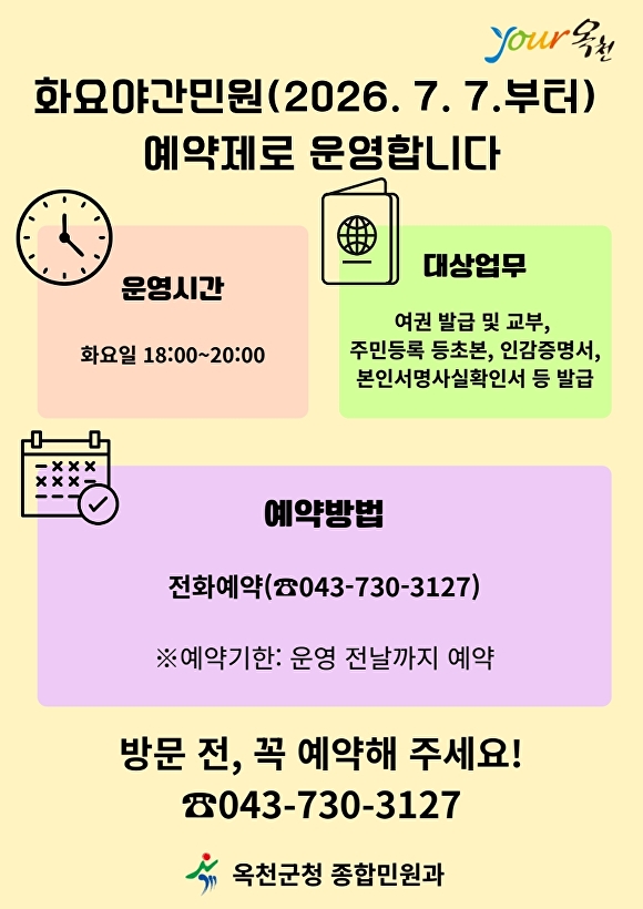 옥천군은 군민의 불필요한 대기와 재방문을 줄이기 위해 오는 7월 7일부터 화요야간민원실을 예약제로 전환한다고 9일 밝혔다.
