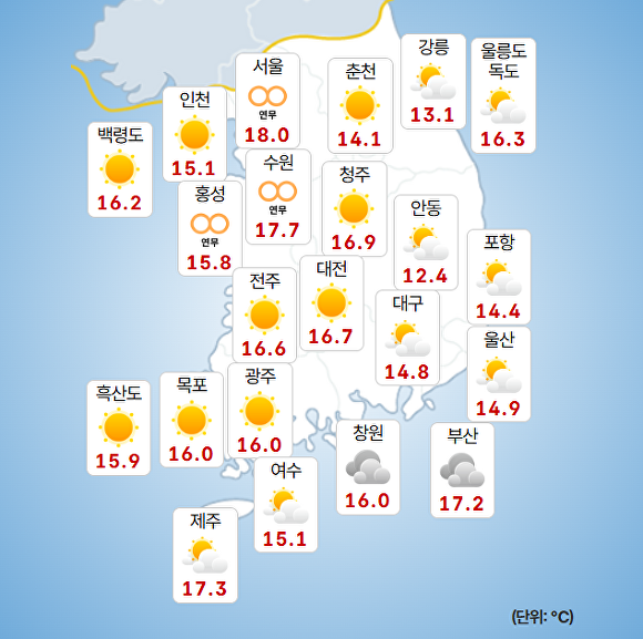 부산지방기상청에 따르면 이날 오전 9시 현재 주요 지역의 기온은 부산 17.2도, 울산 14.9도, 창원 16도로 기록됐다.