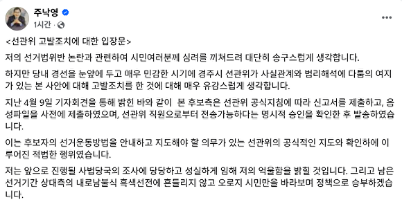 주 예비후보는 14일 자신의 페이스북을 통해 '선관위 고발조치에 대한 입장문'을 내고 "선거법 위반 논란으로 시민 여러분께 심려를 끼쳐드린 점 송구스럽게 생각한다"면서도 “당내 경선을 앞둔 민감한 시기에 사실관계와 법리 해석에 다툼의 여지가 있는 사안을 고발 조치한 데 대해 매우 유감스럽다"고 했다.