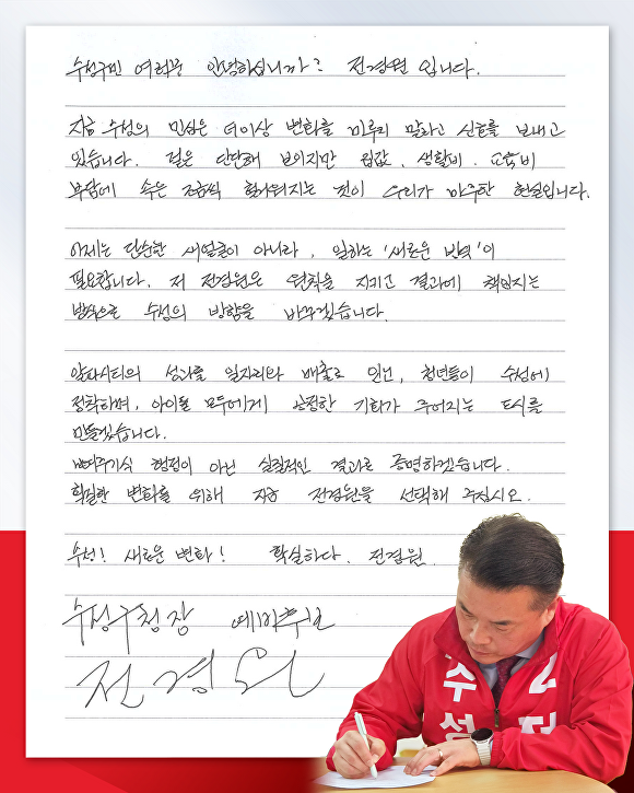 전경원 예비후보는 “수성이 왜 변화를 요구하는지는 이미 확인됐다”며 “이제는 방향을 바꾸고 실행으로 증명할 사람을 선택할 시간”이라고 말했다.